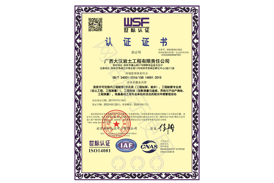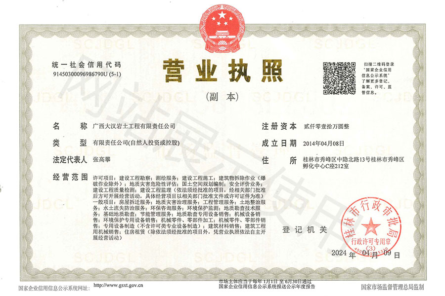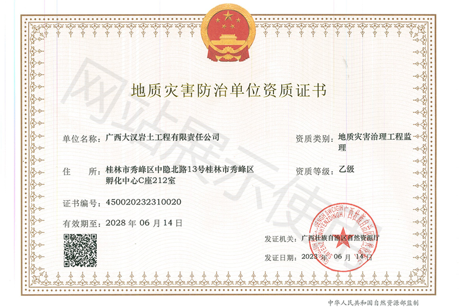 公司董事長具有巖土工程從業經歷20年以上,國家注冊巖土工程師,建筑/礦業建造師,中國工程建設標準專家庫專家,參與主編/參編多項中華人民共和國國家標準規范。在公司董事長的帶領下,公司及公司主要負責人本著“專注巖土,鑄就品質”的品牌觀,以“質量至上,安全第一”為運營觀,完成多項諸如華潤集團、華邦建設、中節能鐵漢建設、五礦集團、廣西建工集團、中聯世紀建設集團、中鐵建桂旅等集團公司委托的工程項目任務,同時參與省內各地市政府主管部門及投資公司、各大國家級園區、院校建設項目工程,并建立了長期的互信互利的戰略合作采購伙伴關系,獲得了主管部門及業主良好的口碑。